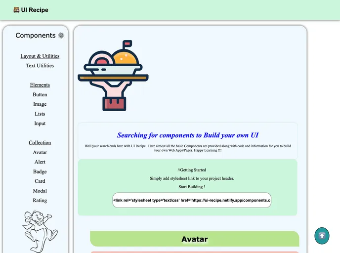 UI Recipe is a CSS component library which provides almost all the basic Components along with code and information for you to build your own Web Apps/Pages. Happy Learning !!!
