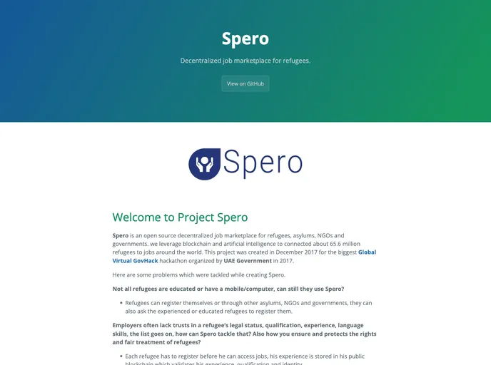 Project Spero is an open source decentralized job marketplace for refugees, asylums, NGOs, and governments. It leverages blockchain and artificial intelligence to connect about 65.6 million refugees to jobs around the world. The project was created in December 2017 for the biggest Global Virtual GovHack hackathon organized by the UAE Government in 2017.