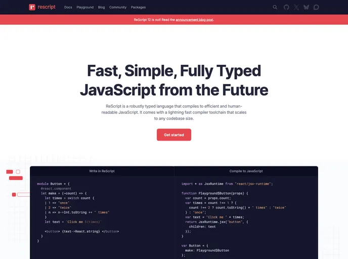 ReScript is a robustly typed language that compiles to efficient and human-readable JavaScript.